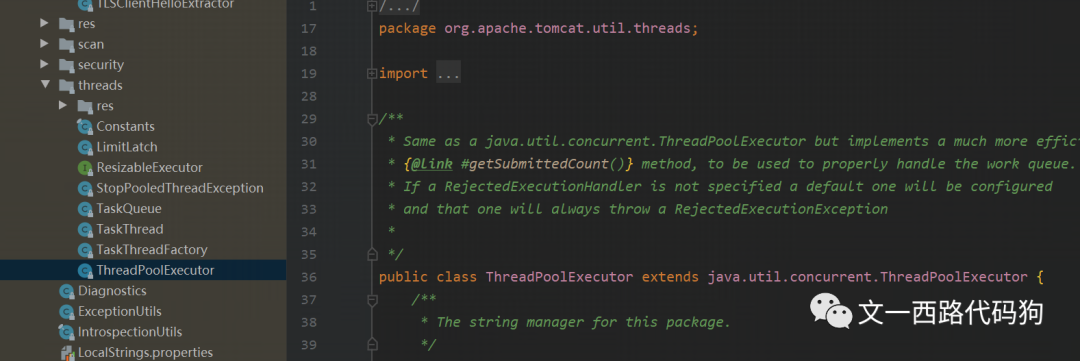 在上面介绍了获取到的Tomcat线程池对象ThreadPoolExecutor executor,我们一看这个线程池类,竟然是ThreadPoolExecutor ,难道就是JUC并发包中的ThreadPoolExecutor ?聪明的我赶紧看看Tomcat的源码,非也非也,原来这个ThreadPoolExecutor 是Tomcat扩展了java.util.concurrent.ThreadPoolExecutor,Tomcat根据自己独特的业务场景定制实现的一个线程池。