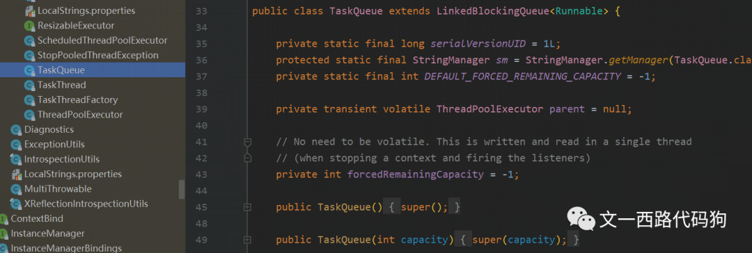 我们看ThreadPoolExecutor构造方法的参数,核心线程数、最大线程数这些没有太大意义就不用看了,重点关注taskqueue这个参数。