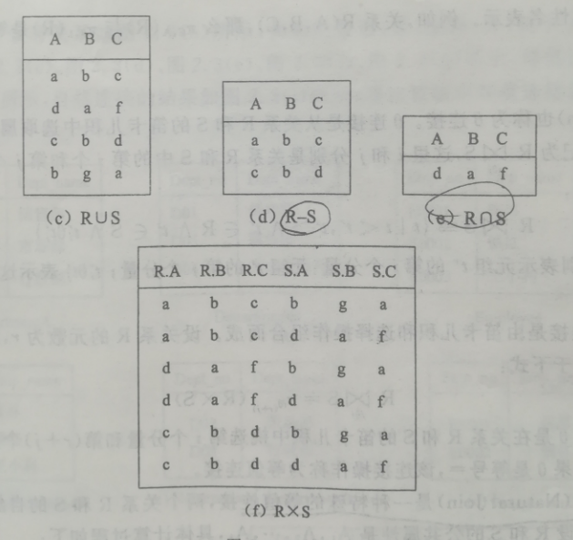 并运算: R U S 差运算: R - S 交运算: R ∩ B 笛卡儿积: R x S (组合运算)