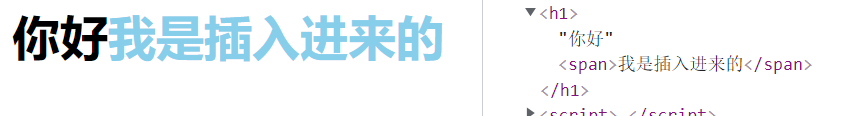 </head><body><h1>你好</h1><span>我是插入进来的</span><script>var oH1 = document.querySelector("h1");var osp = document.querySelector("span");oH1.appendChild(osp);</script>