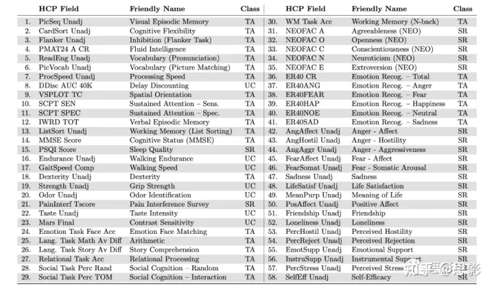 我们选取了58个行为指标,包括认知、社会、情绪和人格特质(附表2)。这些指标包括来自NIH Toolbox的指标和一些著名的非NIH指标(例如,NEO-FFI)。如果没有明确属于"任务-表现"、"自我报告"两个类别之一,则将这些指标分为"未分类"。