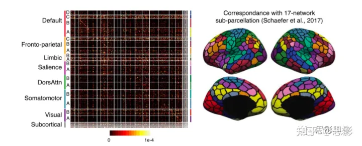 附图4 (左)两两ROI交互作用对任务-行为可解释方差的贡献。颜色对应图3和图5中使用的7-网络分块。(右)对应17-网络的子网络分割