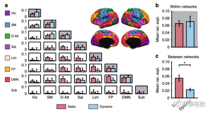 a.行为差异由网络内(阴影图)和网络间(无阴影图)的静态和动态FC解释。使用7个皮层网络:视觉(VIS)、躯体运动(SM)、背侧注意(D-Att)、突显(Sal)、边缘(Lim)、额顶(FP)、默认网络(DMN)和19个皮层下区域(Sub)。b.网络内静态FC和网络间动态FC解释的行为方差无统计学差异。c.网络间静态FC比网络间动态FC 解释更多的行为方差(p = 8.31 × 10-3;双边t检验)。误差条表示结果的标准差