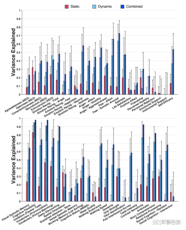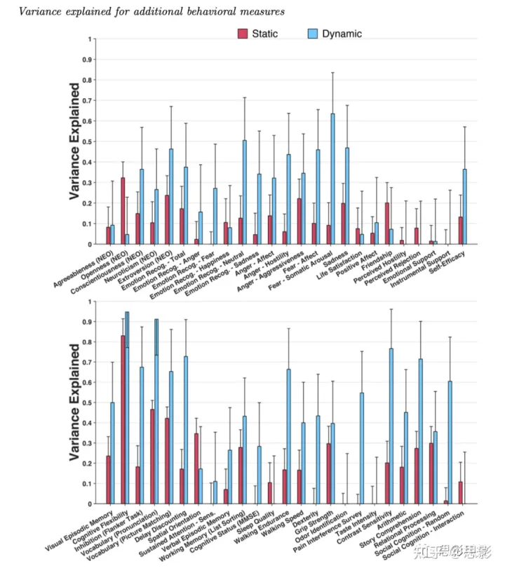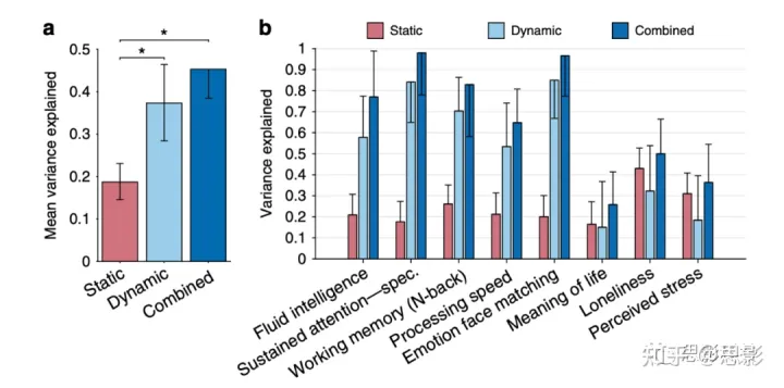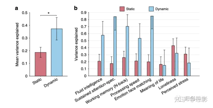 a.对58项行为指标上平均,动态FC(蓝色, 37 %)比静态FC (红色,19 %)解释了更多的行为变异(p=8.31×10-4;双边t检验)。b.方差解释了8个代表性指标。其中,静态FC利用皮尔逊相关性,动态FC利用一阶自回归模型的系数矩阵。误差条表示标准差(SD)