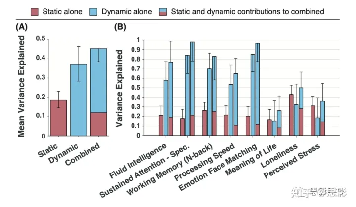 误差条表示结果的标准差。结合静态和动态FC时解释的方差也被表示(深蓝色)。