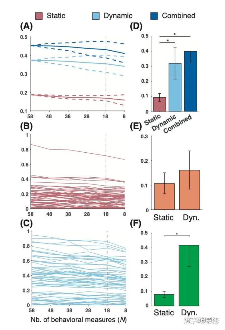 (A)使用100个样本,在N个随机选择的维度上,平均可解释方差的平均值(直线)和标准差(虚线)。(B-C)在静态(B)和动态(C)情况下,使用N-1个其他随机选择的维度计算的所有个体维度的平均可解释方差。(D-F)使用N = 18 (虚线灰色线条)重复我们的主要结果。均值和标准差由100点估计值计算得到,而不是通过折刀法。误差条表示结果的标准差。