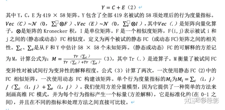 使用方差成分模型研究FC与行为度量指标之间的联系。模型输入为(i)一个包含N = 419名被试的58个行为度量指标的矩阵和(ii)至少一个N×N矩阵,称为相似矩阵,用K表示,其第i,j项编码了受试者i和j的(静态或动态) FC之间的相似性。注意,静态FC矩阵是对称的,而动态FC矩阵是非对称的。该模型估计了FC变异性所解释的行为变异水平,包括所有行为度量指标的平均值以及每个行为度量指标的平均值。