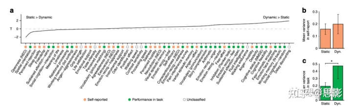 a行为指标是根据动态FC是否比静态FC解释了更多的变异而排序的。正的t统计量T表明动态FC比静态FC能解释更多的方差。任务-表现对应的行为度量指标用绿色圆点标记,自我报告测量用橙色圆点标记。