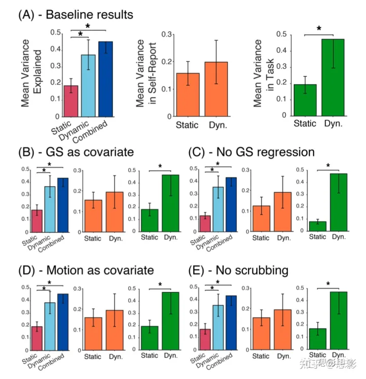 (A)原始实验的主要结果(B)将平均灰度信号的方差作为协变量时的主要结果。(C)未对fMRI时间序列进行灰度均值处理时,计算静态和动态功能连接矩阵的主要结果。(D)将头部运动指标(平均FWD、最大FWD)作为方差分量模型的协变量时的主要结果。(E)全体 fMRI时间序列计算静态和动态FC矩阵的主要结果。