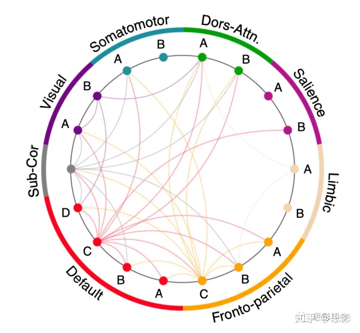 网络及对应颜色同图3,子网络按照Schaefer等人划分的网络,如附图4所示。边的颜色由它们的节点位置定义,并且只显示在q=0.05水平上经过FDR校正的连接。