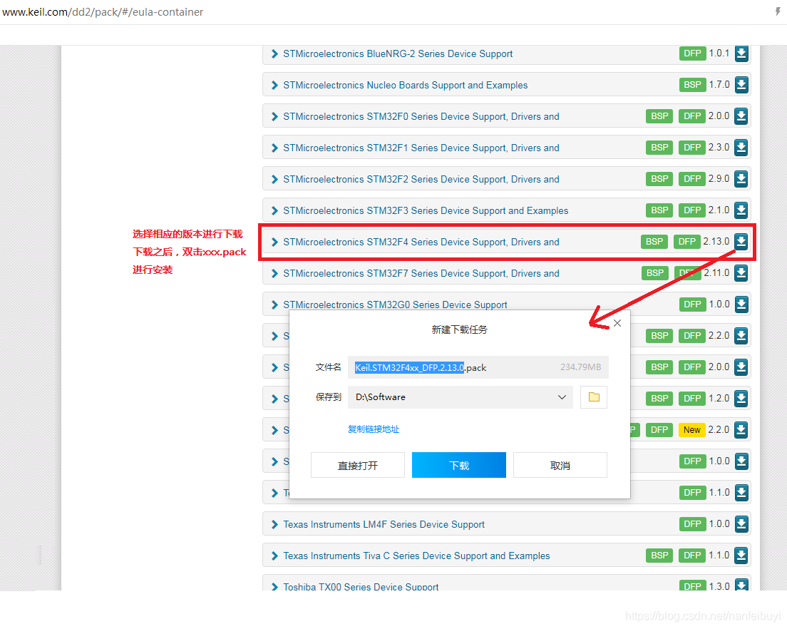 3.2 下载安装STM32F40器件支持包:http://www.keil.com/dd2/pack/