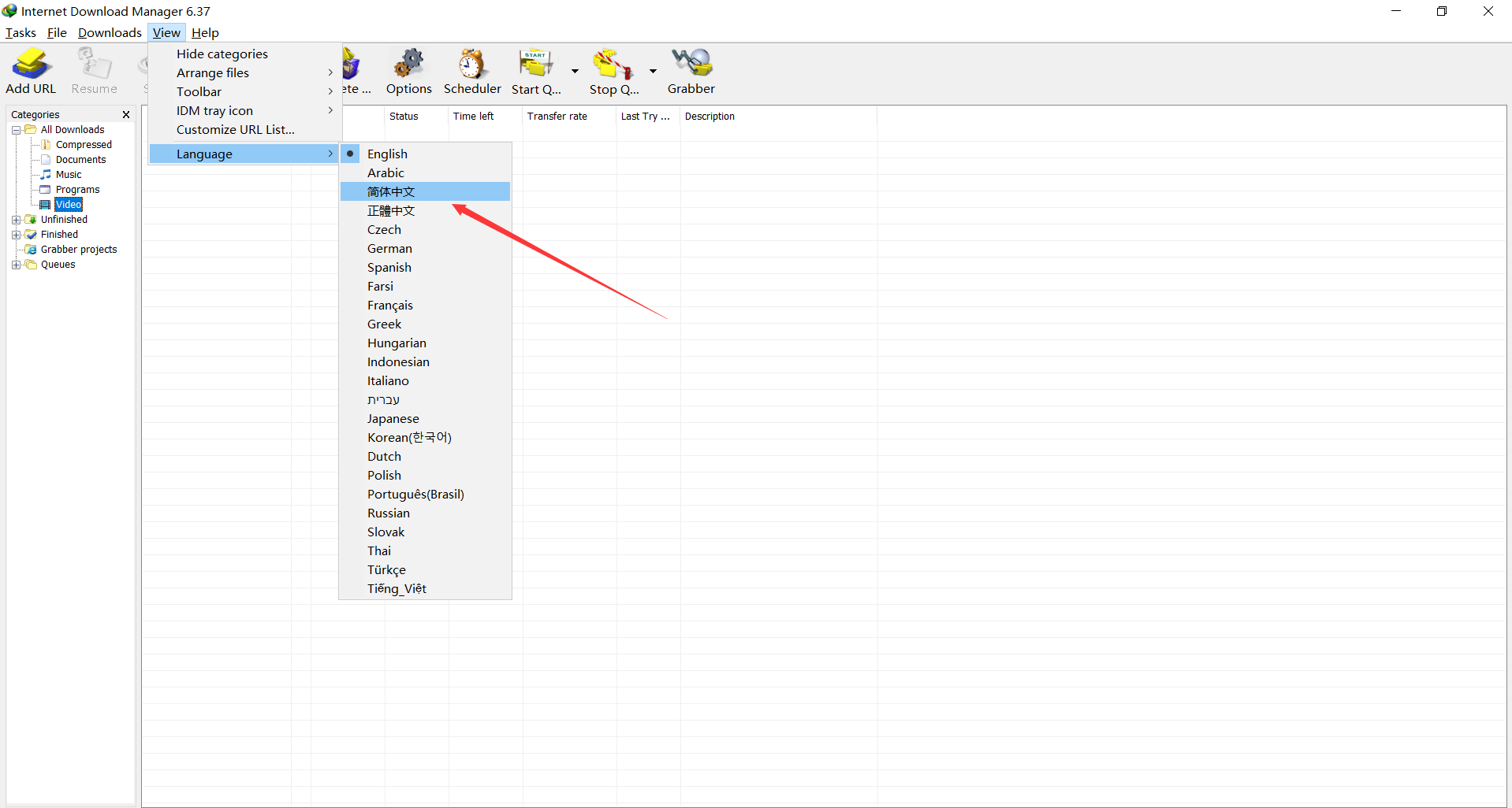 打开IDM软件,此时界面全是英文,点击View->Language->简体中文。点击完成后软件自动退出,此时再次打开界面变成中文。