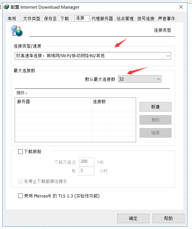 然后到连接目录下。选择较高速率连接和默认最大连接数选择为32。完成后即可。