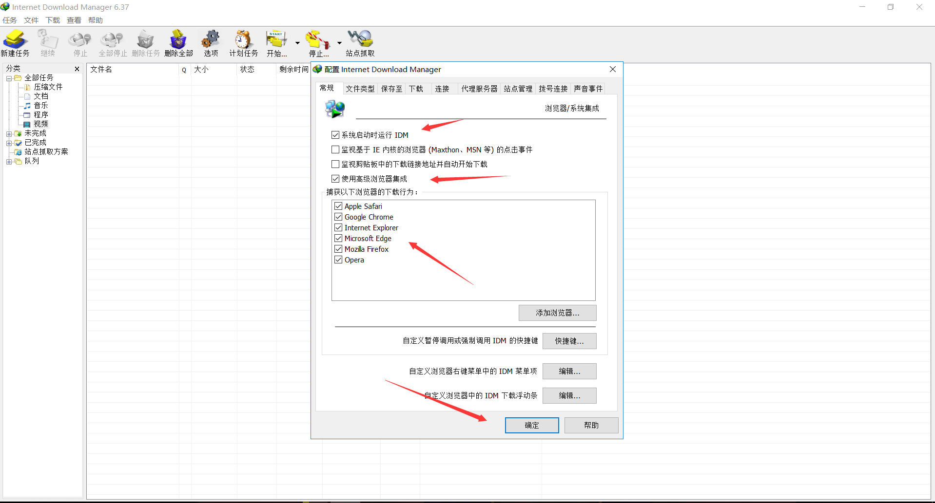 打开IDM软件,点击选项按钮,在常规界面下勾选这几个方框,集成到浏览器里面。点击确定。