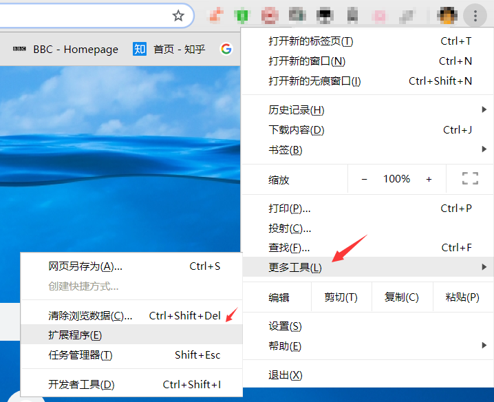 打开chrome软件,按照下图进入拓展程序界面。