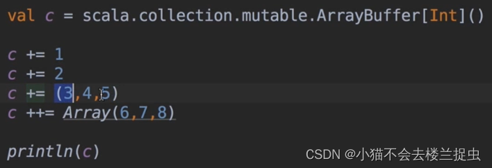 object StringApi extends App {val name = "itcats_cn"val job = "student"val age = 999.999d//普通输出 加了, 会自动产生一个()println("name=" + name, "job=" + job) //输出结果 (name=itcats_cn,job=student)// 文字'f'插值器允许创建一个格式化的字符串,类似于 C 语言中的 printf。// 在使用'f'插值器时,所有变量引用都应该是 printf 样式格式说明符,如%d,%i,%f 等。println(f"姓名: $name%s 年龄: $age%1.2f 职业: $job") // 该行输出有换行printf("姓名: %s 年龄: %1.2f 职业: %s", name, age, job) // 该行输出没有换行// 's'允许在处理字符串时直接使用变量。// 在println语句中将String变量($name)附加到普通字符串中。println()println(s"姓名: ${name} 年龄: $age 职业: $job") //可以{}也可以不{}// 字符串插入器还可以处理任意表达式。// 使用's'字符串插入器处理具有任意表达式(${1 + 1})的字符串(1 + 1)的以下代码片段。 任何表达式都可以嵌入到${}中。println(s"1 + 1 = ${1 + 1}") // 1 + 1 = 2//多行字符串演示(连续输入三个"后按回车)val c ="""|Hello|World""".stripMarginprintln(c)
