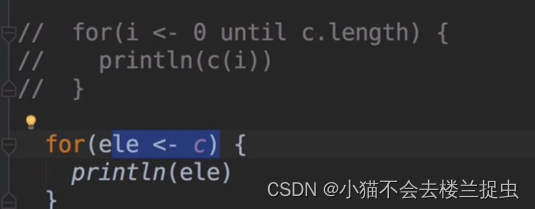 注:{}和()对于for表达式来说都可以。for 推导式有一个不成文的约定:当for 推导式仅包含单一表达式时使用原括号,当其包含多个表达式时使用大括号。值得注意的是,使用原括号时,早前版本的Scala 要求表达式之间必须使用分号。