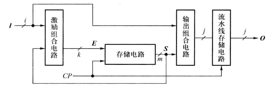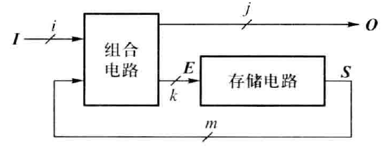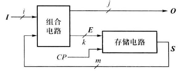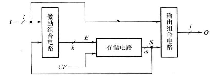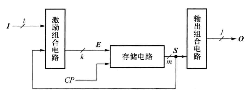 时序电路的基本结构如下图所示,它由完成逻辑运算的组合电路和起记忆作用的存储电路两部分构成,其中,存储电路由触发器或锁存器组成。为了方便,图中各组逻辑变量均已向量形式表示,其中,为输入信号,