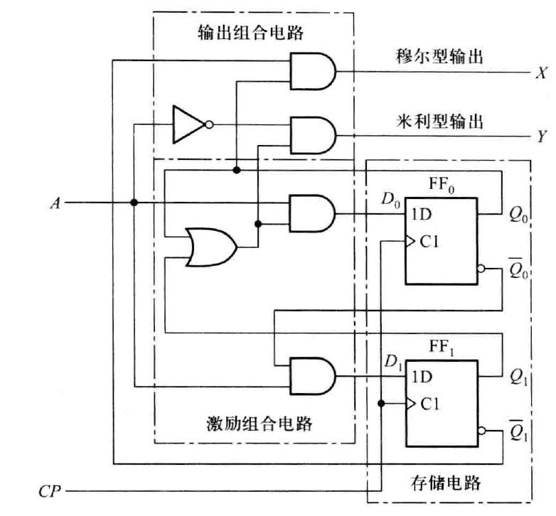 在进入时序电路的分析前,先解释一下穆尔和米利的概念,在时序电路中,可以根据输出信号的特点,将其分为穆尔(Moore)型和米利(Mealy)型时序电路。在穆尔型时序电路中,输出信号仅仅取决于存储电路的状态;在米利型时序电路中,输出信号不仅取决于存储电路的状态,而且还取决于外部输入信号。