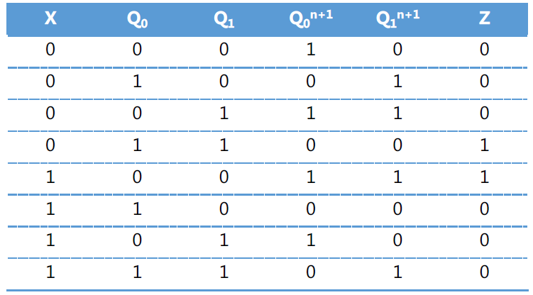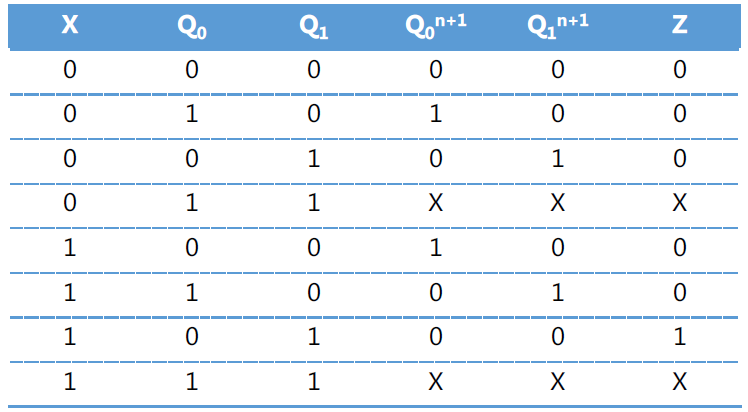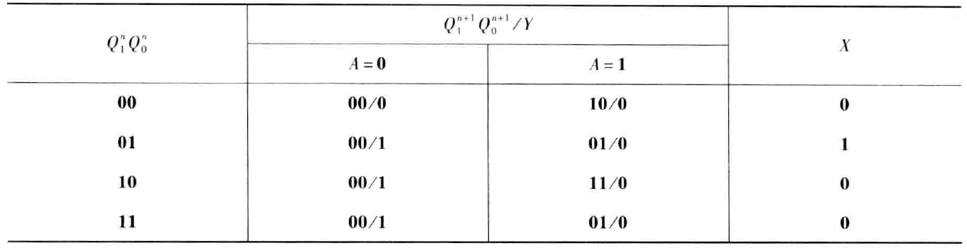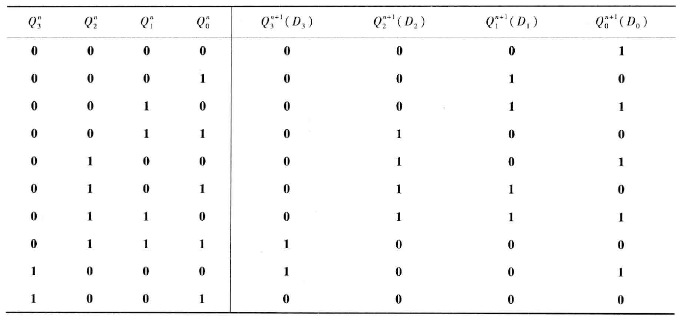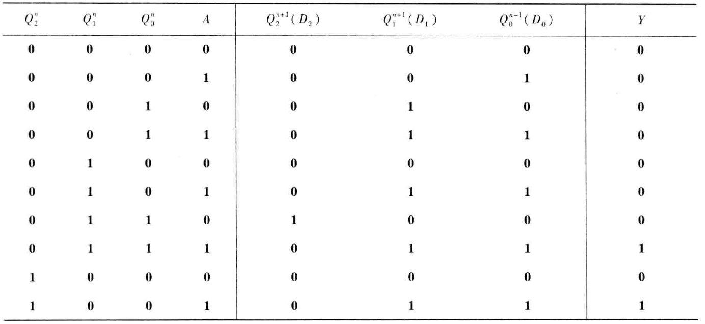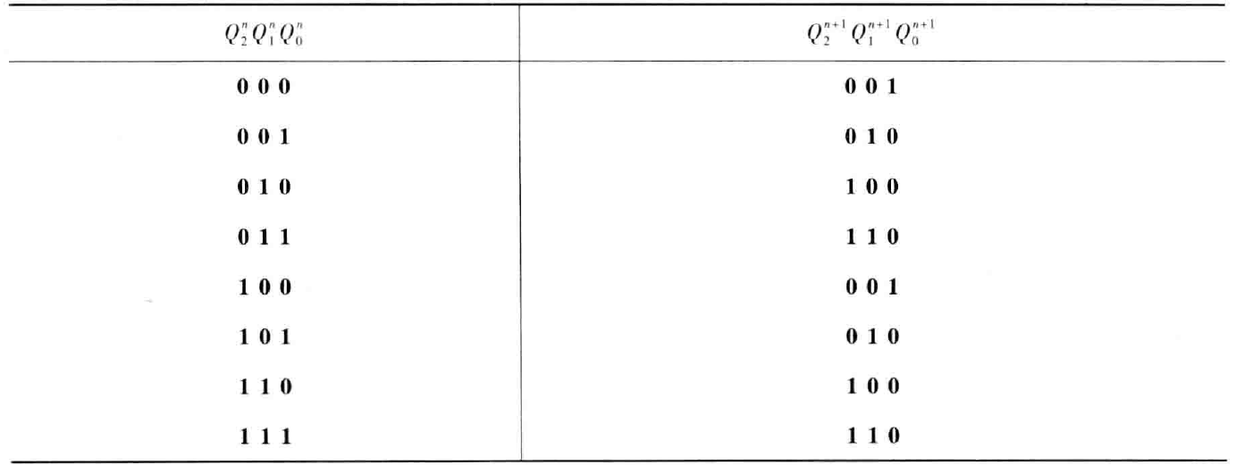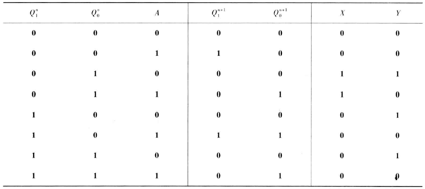 根据逻辑方程组中的转换方程组和输出方程组列出真值表,如下表所示。真值表的输入变量为、