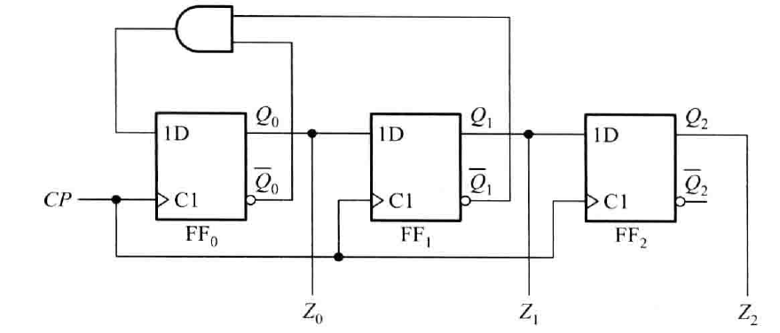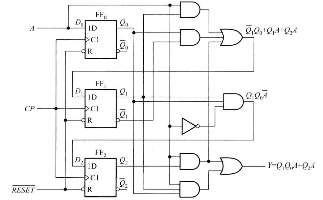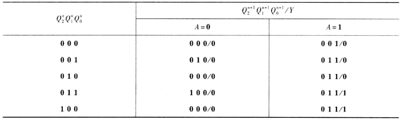 该电路需要用3个触发器实现(共有5个状态,3个触发器能实现8个状态),它们的输出分别为