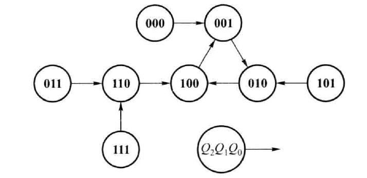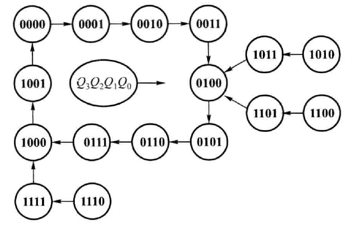 该电路有6个无效状态:1010、1011、1100、1101、1110和1111,分别以它们作为现态,带入电路的转换方程组而求其次态。如果还没有进入有效状态,再以新的状态作为现态求下一个次态,以此类推,看最终能否进入有效状态。结果证明,这6个状态在一或两个时钟周期后全部都能进入有效循环状态。