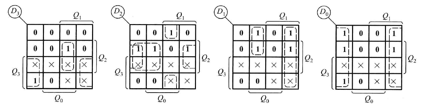 4个触发器可组合 16个状态(0000~1111),其中有6个状态(1010~1111)在8421BCD计数器中是无效状态,在卡诺图中以无关项×表示(包含“1”项尽可能多地圈入无关项,但是不要圈中均为无关项)。于是,得到激励方程组(本例中,激励方程组也是转换方程):