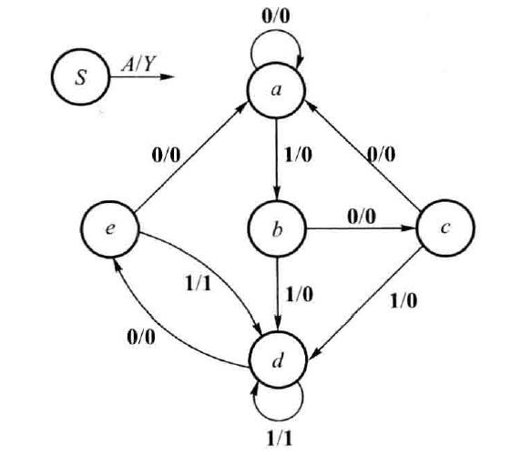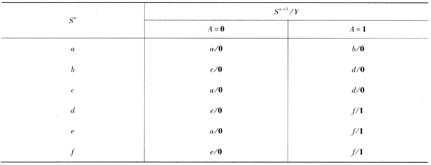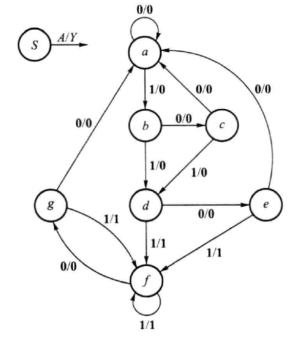 上述状态花间过程将原有的7个过程化简为5个,而输入-输出特性与原始状态表和原始状态图完全相同。