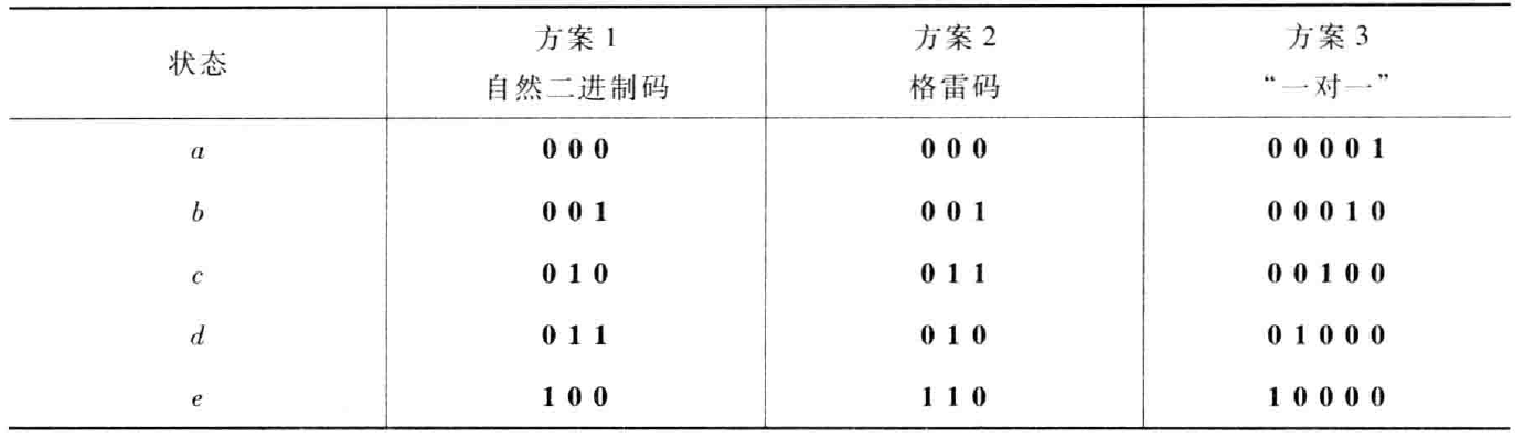 上表中所列方案3为“一对一”(One-hot Encoding)编码方案。虽然这将使用较多的触发器,但它的编码方案非常简单,可有效地化简电路,并换得工作可靠性和工作速度得提高。在大规模可编程逻辑器件,如FPGA中,触发器数量较多而逻辑门相对较少,“一对一”的编码方案有时反而更有利于提高器件资源的利用率。