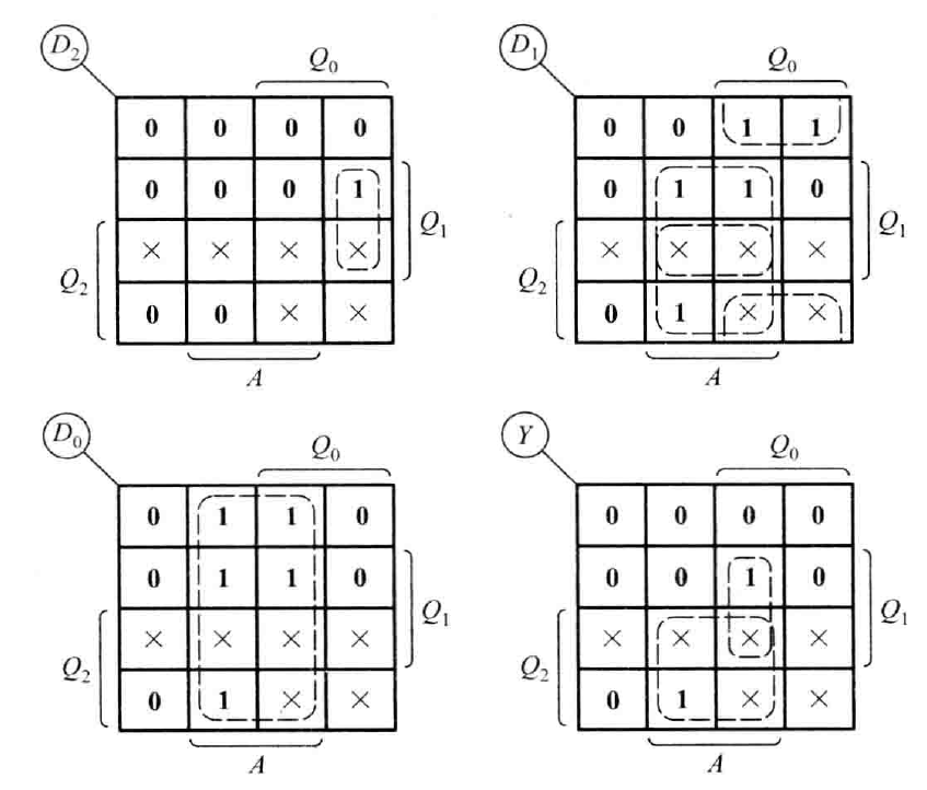 京卡诺图化简,得到三个触发器的激励方程组:,