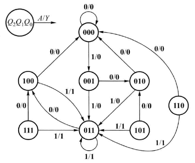 该电路有3个无效状态:101、110和111,需要评估电路受到外界干扰时万一落入这3个无效状态的影响。将101、110和111分别作为现态,与可能出现的所有输入信号一起分别带入电路的转换方程组而求其次态。结果证明,无论在何种情况下,这3个状态在一个时钟周期后全部都能进入有效状态。于是,可以进一步画出完全状态图如下所示: