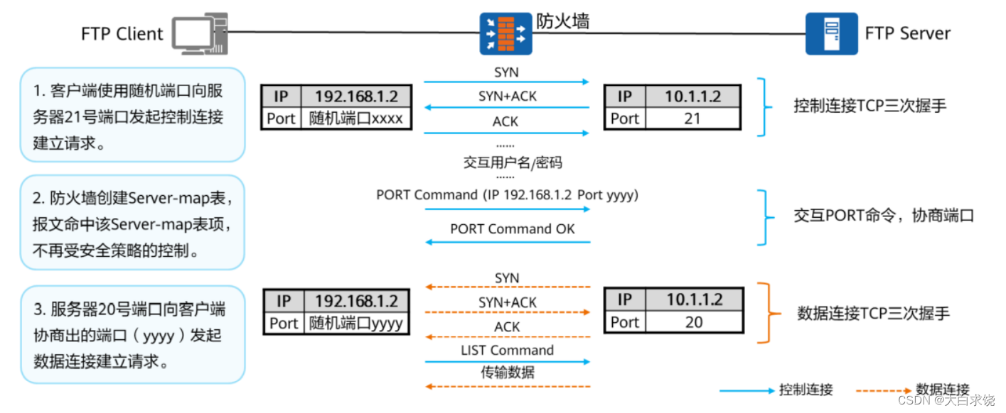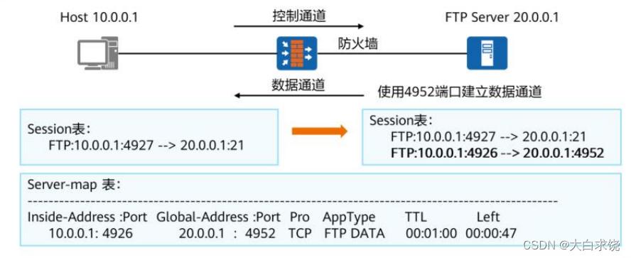 由于PORT命令的应用层信息中携带了客户端的IP地址和向服务器随机开放的端口防火墙通过分析PORT命令的应用层信息,提前预测到后续报文的行为方式,根据应用层信息中的IP和端口创建Server-map表。服务器向客户端发起数据连接的报文到达防火墙后命中该Server-map表项,不再受安全策略的控制。