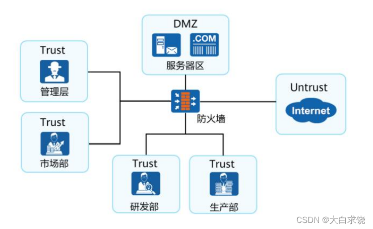 防火墙作为企业网络的重要组成部分,连接着企业网络管理层网络、市场部网络与服务器网络。防火墙一般部署在企业网络出口,与Internet连接。因此防火墙一般部署在不同区域之间用于网络的控制。(路由器用于数据转发,防火墙用于数据的控制)