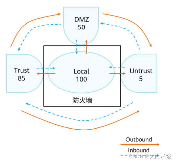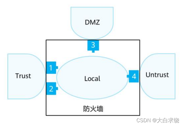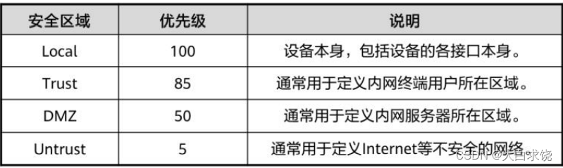 不同的网络受信任程度不同,在防火墙上用安全区域表示网络后,在华为防火墙上,每个安全区域都有一个唯一的优先级,用1至100的数字表示,数字越大,则代表该区域内的网络越可信。