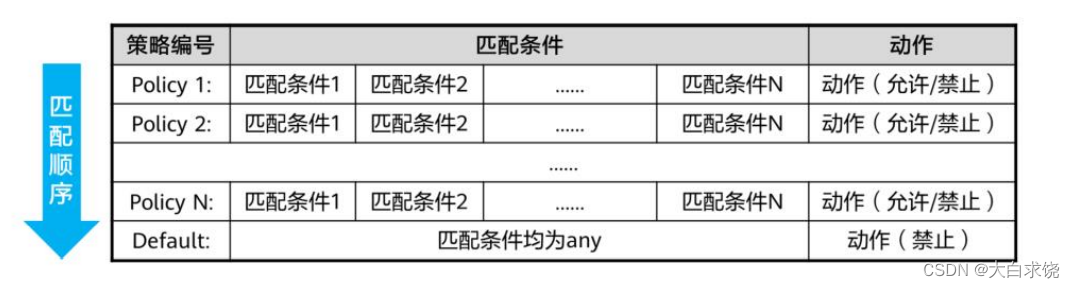 安全策略是由匹配条件(五元组、用户、时间段等)和动作组成的控制规则,防火墙收到流量后对流量的属性(五元组、用户、时间段等)进行识别,并将流量的属性与安全策略的匹配条件进行匹配。