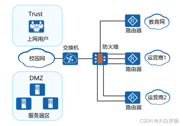 ·如图所示,防火墙作为安全网关部署在校园网出口1、提供内、外网互访的安全隔离和防护。例如︰提供传统的基于IP地址的安全策略制定和网络访问控制;