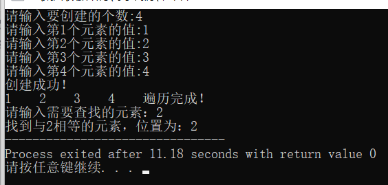 //查找结点 successint Search(Linklist L){Lnode *p=L;int i=1; //哨兵 int a=0; //需要查找的值 int j=0; //值所在的位置 printf("请输入需要查找的元素:"); scanf("%d",&a); while(p->next){p=p->next;if(a==p->data){j=i;printf("找到与%d相等的元素,位置为:%d",a,j);return 1;}i++; }printf("未找到!!");return -1;}