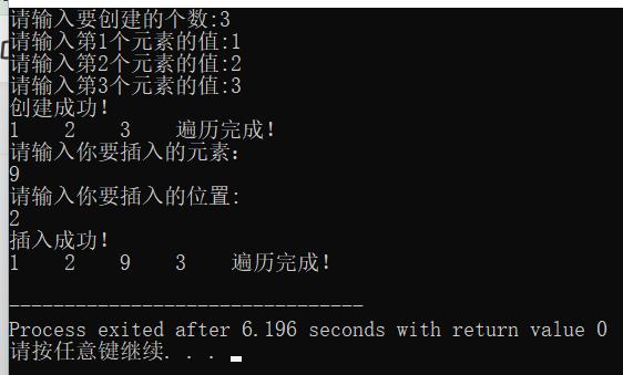 //插入元素 int Insert(Linklist &L){Lnode* p;int data,place;int flag=1;printf("请输入你要插入的元素:\n");scanf("%d",&data);printf("请输入你要插入的位置:\n");scanf("%d",&place);p=Find2(L,place); //此处调用前面的序号查询 if(p==NULL){printf("位置错误!");return -1;}else{Lnode *H=(Lnode *)malloc(sizeof(Lnode));H->data=data;H->next=p->next;p->next=H;printf("插入成功!\n");}}
