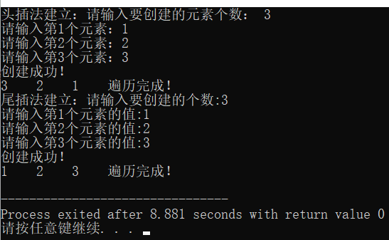 思路:申请头节点并置空(NULL);依次读入元素,如果不是结束符(可任意自定)则申请结点,将新结点插在头节点之后。但是,此类方法插入的元素与输出的顺序相反。
