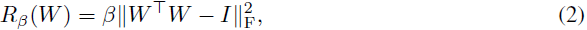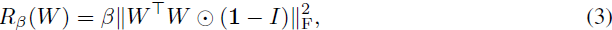 其中 W 是权重矩阵,β 是超参数。 众所周知,这种正则化通常过于局限,因此我们探索了几种旨在放松约束的变体,同时仍然赋予我们的模型所需的平滑度。 我们发现最有效的版本从正则化中删除了对角线项,旨在最小化过滤器之间的成对余弦相似性但不限制它们的范数: