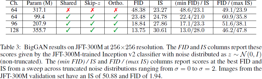 为了确认我们的设计选择对更大、更复杂和多样化的数据集有效,我们还在 JFT-300M 的子集上展示了我们系统的结果。 完整的 JFT-300M 数据集包含 300M 张带有 18K 个类别标签的真实世界图像。 由于类别分布严重的拖尾(long-tailed),我们对数据集进行二次采样,仅保留具有 8.5K 个最常见标签的图像。 生成的数据集包含 292M 图像——比 ImageNet 大两个数量级。 对于具有多个标签的图像,每当对图像进行采样时,我们都会随机且独立地对单个标签进行采样。 为了计算在此数据集上训练的 GAN 的 IS 和 FID,我们使用在此数据集上训练的 Inception v2 分类器。 定量结果如表 3 所示。所有模型均以 2048 的 batch 大小进行训练。我们将模型的消融版本(与 SA-GAN 相当,但 batch 大小更大)与“完整的” BigGAN 模型进行了比较,BigGAN 模型使用了应用在 ImageNet 上获得最佳结果的所有的技术(共享 embedding、skip-z 和正交正则化)。 我们的结果表明,即使在相同模型容量(64 个基本通道)下设置这个更大的数据集,这些技术也能显着提高性能。 我们进一步表明,对于这种规模的数据集,我们看到将模型容量扩展到 128 个基本通道的显着额外改进,而对于 ImageNet GAN,增加容量并没有好处。
