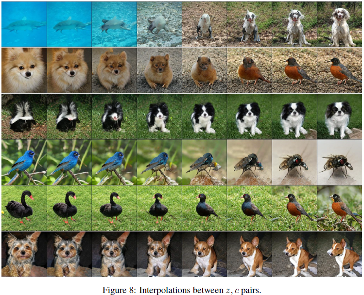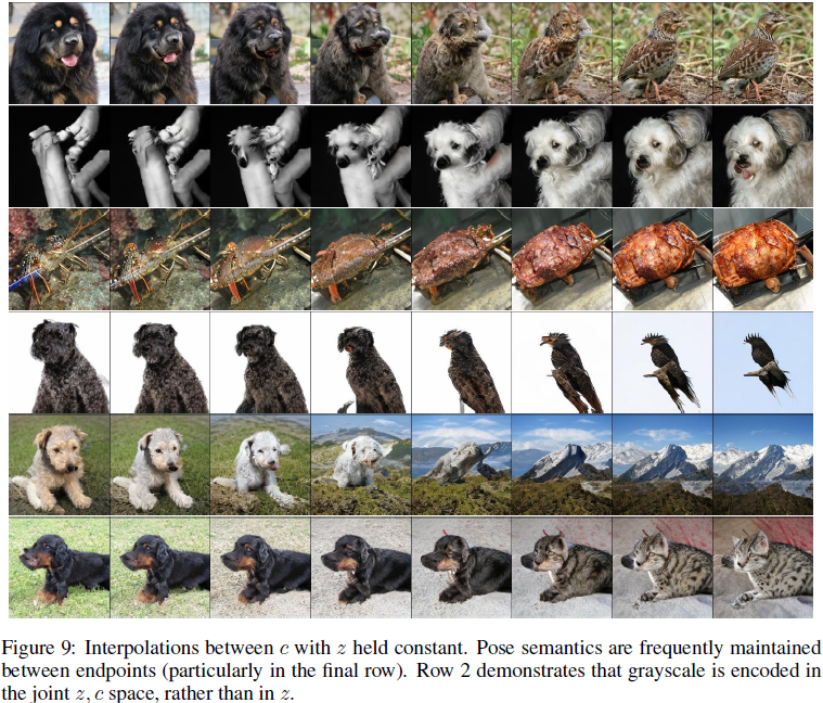 我们观察到 D 过度拟合(记忆)训练集,再加上我们模型的样本质量,提出了一个明显的问题,即 G 是否简单地记住了训练数据。 为了测试这一点,我们在像素空间和预训练分类器网络的特征空间(附录 A)中执行类最近邻分析。 此外,我们在图 8 和图 9 中展示了样本之间的插值和类别插值(其中 z 保持不变)。我们的模型令人信服地在不同的样本之间进行插值,并且其样本的最近邻在视觉上是不同的,这表明我们的模型不只是简单地记住训练数据。