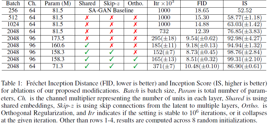 我们首先增加基线模型的 batch 大小,并立即发现这样做的巨大好处。 表 1 的第 1-4 行表明,只需将 batch 大小增加 8 倍即可将最先进的 IS 提高 46%。 我们推测这是每 batch 覆盖更多模式的结果,为两个网络提供更好的梯度。 这种扩展的一个显着副作用是,我们的模型在更少的迭代中达到更好的最终性能,但变得不稳定并经历完全训练崩溃。 我们在第 4 节中讨论了这种情况的原因和后果。对于这些实验,我们报告了崩溃前保存的检查点的分数。