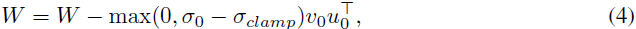 为了确定这种病态是崩溃的原因还是仅仅是一种症状,我们研究了对 G 施加额外条件以明确抵消谱爆炸的影响。 首先,我们直接将每个权重的最大奇异值 σ0 正则化为固定值 σ_reg 或第二大奇异值 σ1 的某个比率 r,r·sg(σ1) (使用 sg 停止梯度操作以防止正则化增加 σ1)。 或者,我们采用部分奇异值分解来代替钳位(clamp) σ0。 给定一个权重 W,它的第一个奇异向量 u0 和 v0,以及 σ_clamp(clamp σ0 的值),我们的权重变为: