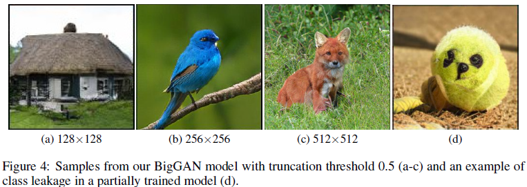 我们注意到,我们的部分训练模型的某些失败模式与之前观察到的不同。 大多数以前的失败都涉及局部伪影(artifacts)、由纹理斑点而不是对象组成的图像、或规范的模式崩溃。 我们观察到类泄漏,其中一个类的图像包含另一个类的属性,如图 4(d) 所示。 我们还发现 ImageNet 上的许多类对于我们的模型来说比其他类更难; 我们的模型在生成狗(占数据集的很大一部分,并且主要通过它们的纹理区分)方面比人群(占数据集的一小部分并且具有更大规模的结构)更成功。 附录 A 中提供了进一步的讨论。
