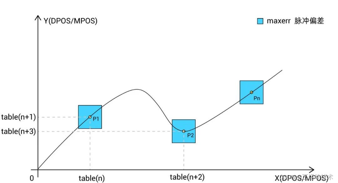 即实际位置坐标点与TABLE的比较点的差值在maxerr范围内便有效,触发时刻为当前位置进入比较点的触发范围内便触发比较,比较范围示意图如下,注意:maxerr的单位为脉冲数的偏差,不是距离的偏差。