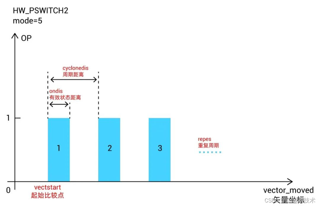⊙说明:此模式无需TABLE,坐标均参考矢量坐标,从vectstart的位置开始比较,每隔cycledis距离触发一次比较,重复比较的周期为repes,每次触发比较信号后,保持ondis距离后关闭信号,等待下一周期的触发。