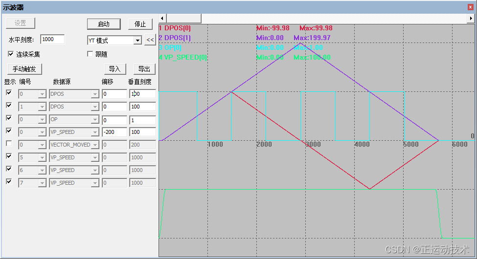 以上模式的实现例程如下,可以自由触发不同的模式,并打开示波器,直观的观察PSO的输出随运动的变化情况。