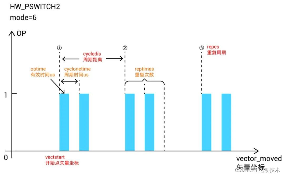 ⊙ 说明: 此模式无需TABLE,坐标均参考矢量坐标,从vectstart的位置开始比较,每隔cycledis距离触发一次比较,重复比较的周期为repes,每次触发比较信号后,保持信号的脉冲宽度由“HW_TIMER”指令设置。