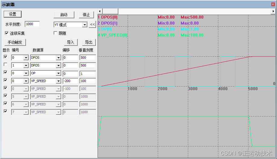 (3)示波器采样波形: 轴0轴1插补的矢量合成位置VECTOR_MOVED(0)每到达一个比较的位置,OP(0)触发反转一次,,直到所有的TABLE的比较完成,OP保持最后一次反转的状态。